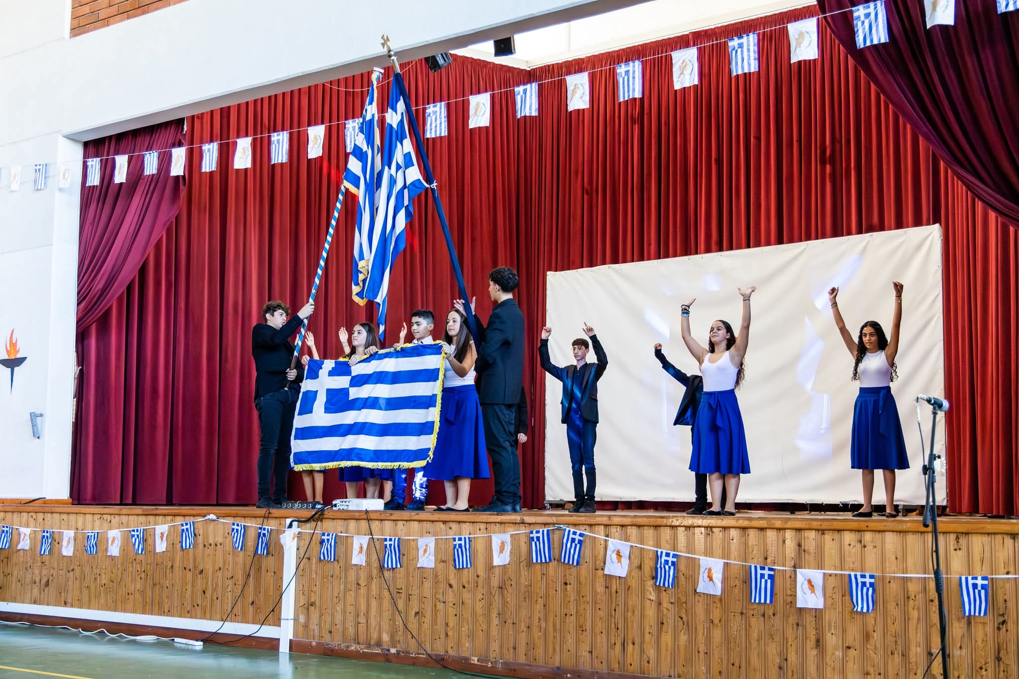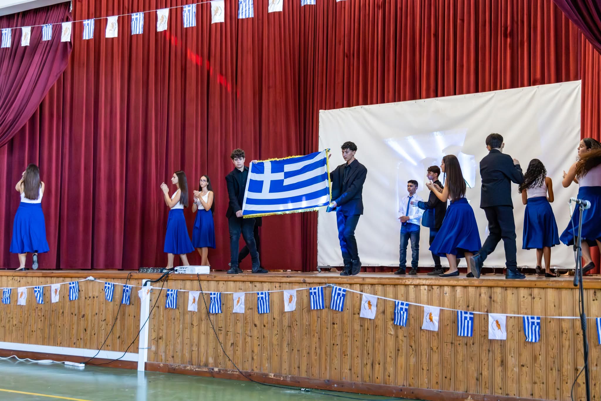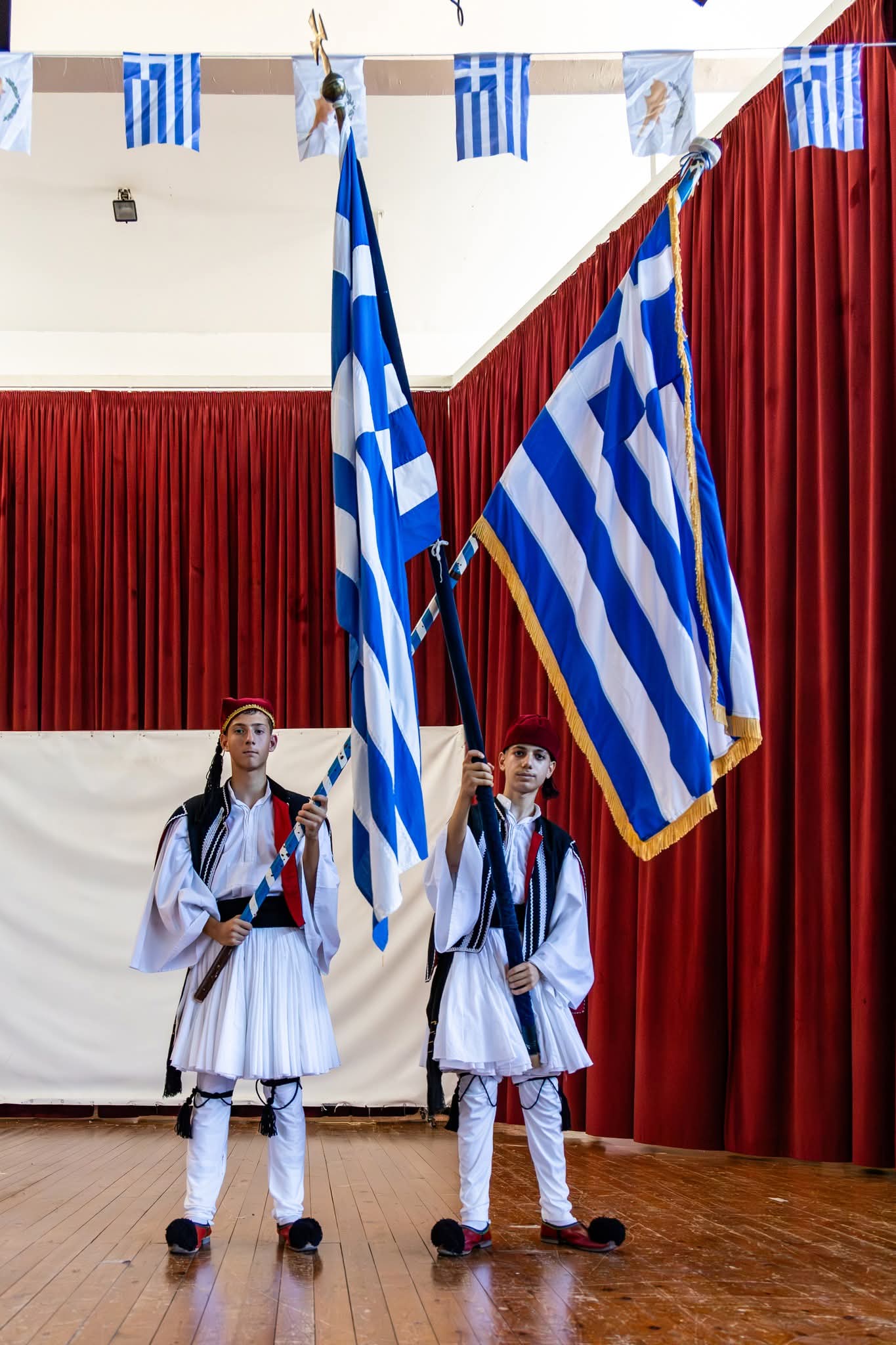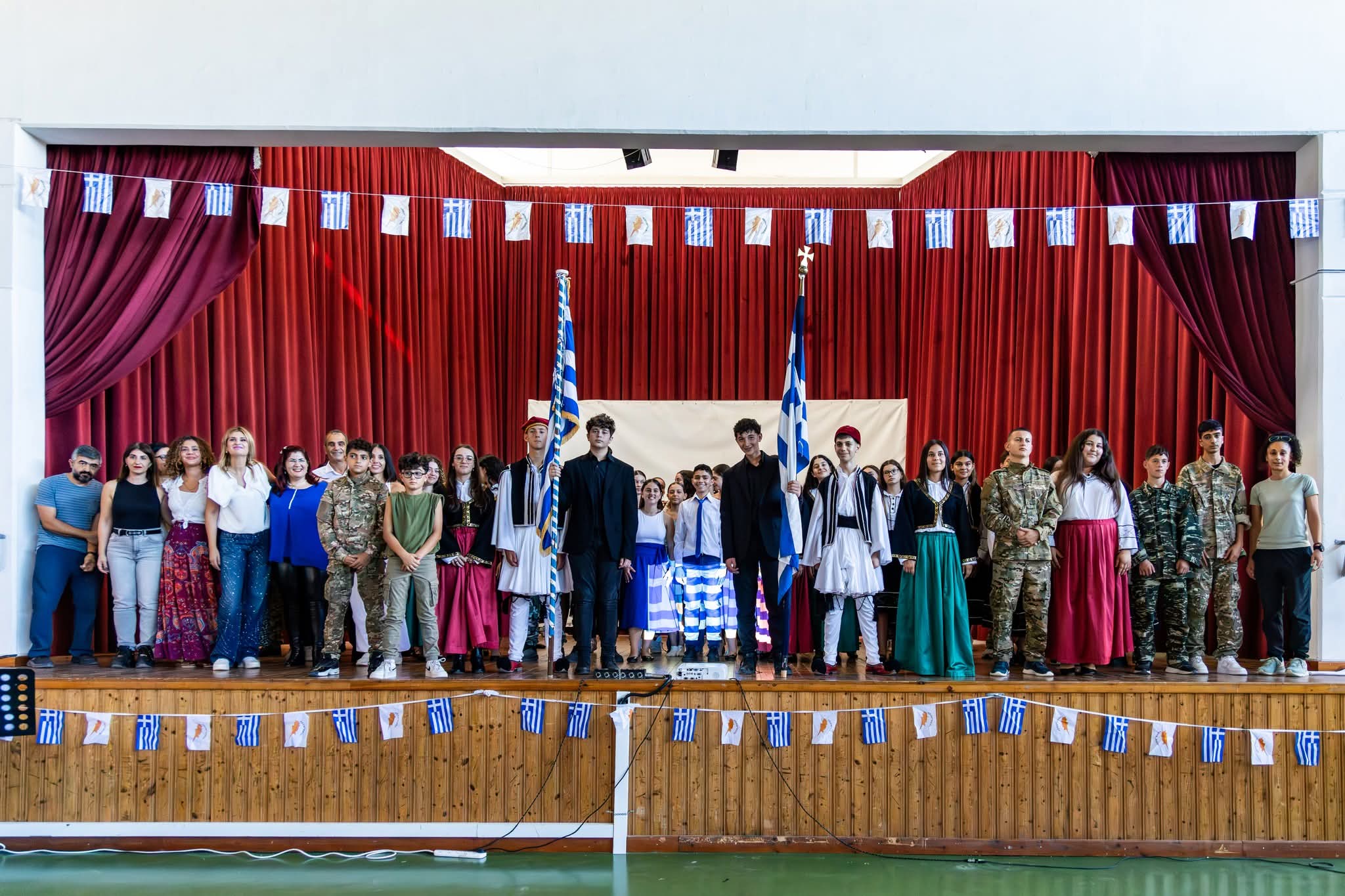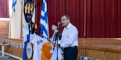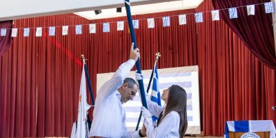 Το πρώτο μέρος της εκδήλωσης περιλάμβανε την τελετή ανακήρυξης των Σημαιοφόρων και Παραστατών, καθώς και την παράδοση του Λαβάρου και των Σημαιών από τον Διευθυντή του Σχολείου μας κ. Ευστάθιο Ευσταθίου.