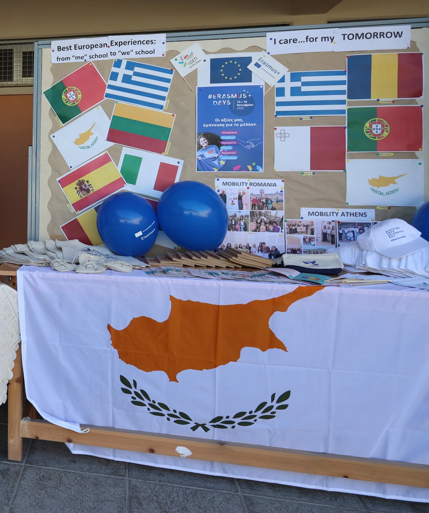 Με αφορμή τις φετινές Ημέρες Erasmus+ και με σύνθημα «Οι αξίες μας, έμπνευση για το μέλλον», το Σχολείο μας γέμισε δημιουργία, μουσική και χρώμα! Μαθητές και εκπαιδευτικοί ένωσαν τις δυνάμεις τους για να αναδείξουν το πνεύμα του Erasmus+: τη γνώση, την αλληλεγγύη και τη χαρά της συμμετοχής. Οι δράσεις:
