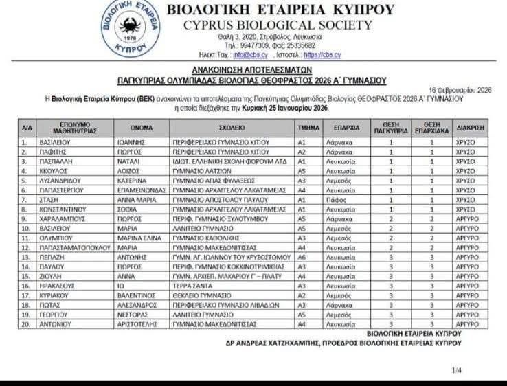 Με τεράστια χαρά και περηφάνια ανακοινώνουμε τα αποτελέσματα της Παγκύπριας Ολυμπιάδας Βιολογίας Θεόφραστος 2026 Α' Γυμνασίου! Οι μαθητές μας Ιωάννης ...