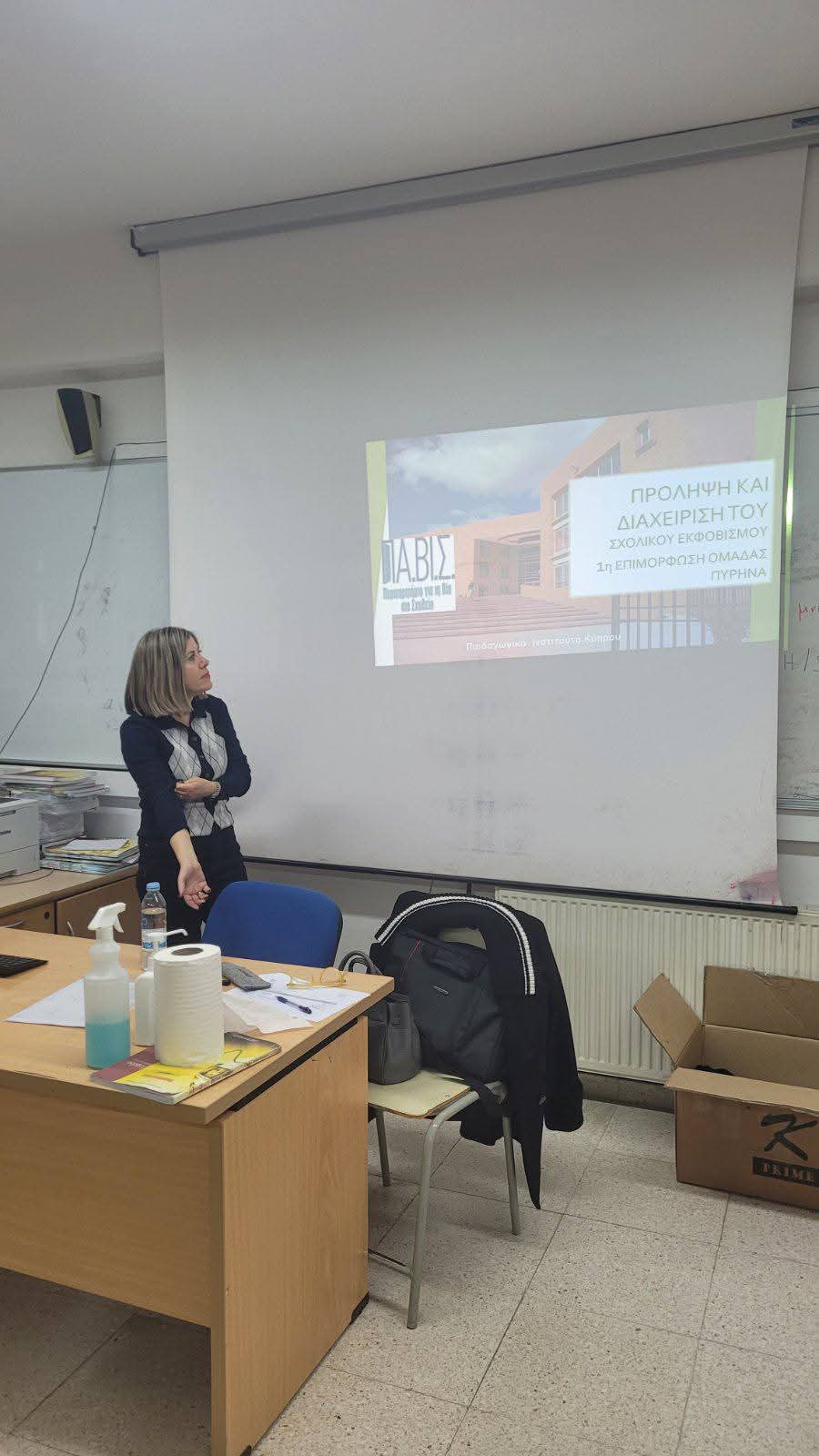 Στις 15 Δεκεμβρίου πραγματοποιήθηκε από τη συνεργάτιδα του ΠΑΒΙΣ κ. Εύα Γεωργιάδη επιμόρφωση των εκπαιδευτικών - μελών της Επιτροπής Αγωγής Υγείας και Πρόληψης της ενδοσχολικής βίας ώστε να γίνουν πυρήνες ενάντια στον σχολικό εκφοβισμό. Στην επιμόρφωση δόθηκε έμφαση στην πρόληψη και τη δημιουργία θετικού κλίματος στο σχολείο.
