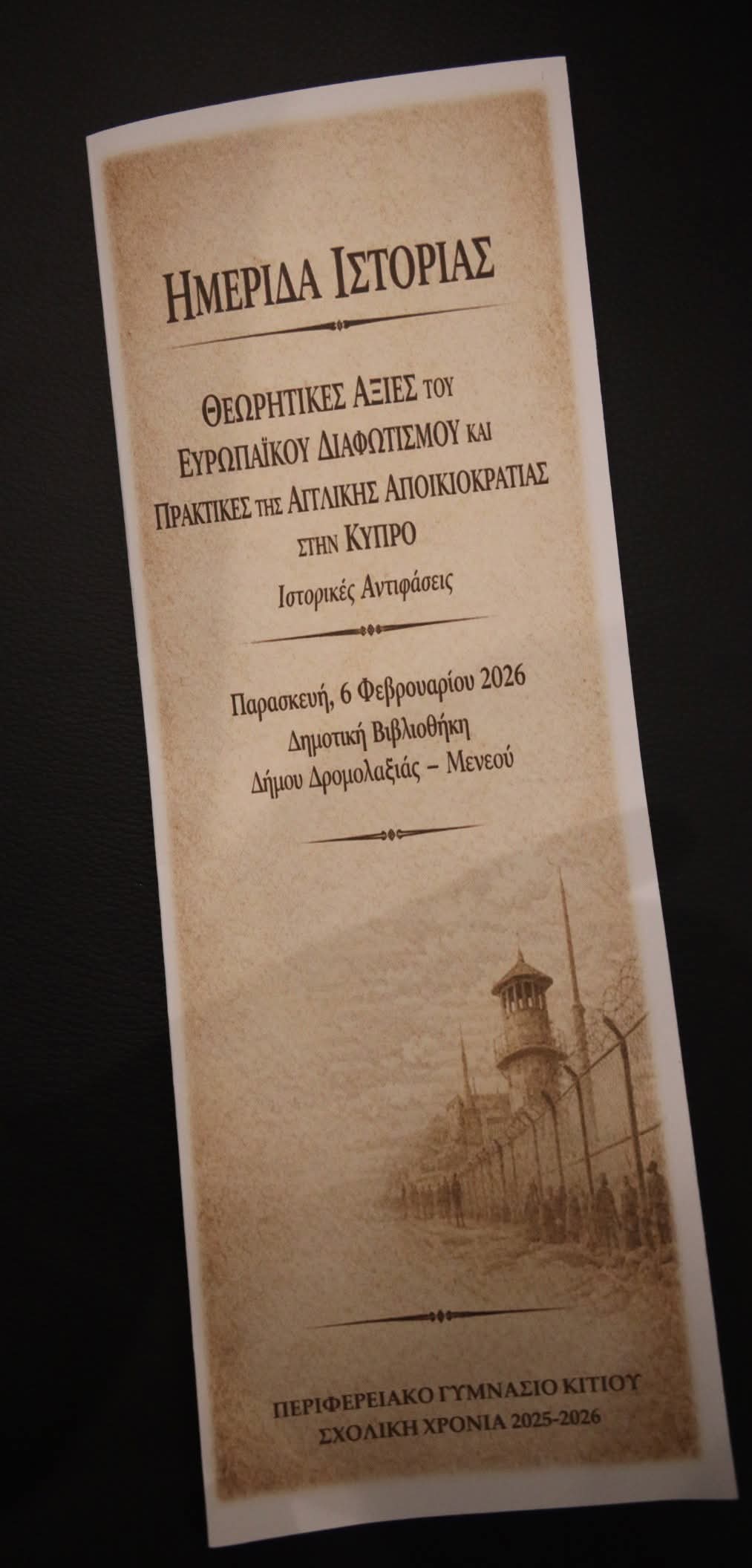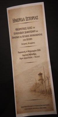 Το Σχολείο μας, με αφορμή τη συμπλήρωση 70 χρόνων από την έναρξη των απαγχονισμών των Αγωνιστών της ΕΟΚΑ (1956–2026), διοργάνωσε την Παρασκευή Μαθητική Ημερίδα Ιστορίας με θέμα: «Θεωρητικές Αξίες του Ευρωπαϊκού Διαφωτισμού και Πρακτικές της Αγγλικής Αποικιοκρατίας στην Κύπρο-Ιστορικές Αντιφάσεις». Η Ημερίδα πραγματοποιήθηκε στη Δημοτική Βιβλιοθήκη Δρομολαξιάς-Μενεού στη Δρομολαξιά. Την ημερίδα παρακολούθησαν εκπρόσωποι της Τοπικής Αυτοδιοίκησης και της Εκπαιδευτικής Υπηρεσίας του Υπουργείου Παιδείας και μαθητές της Γ΄ Γυμνασίου.