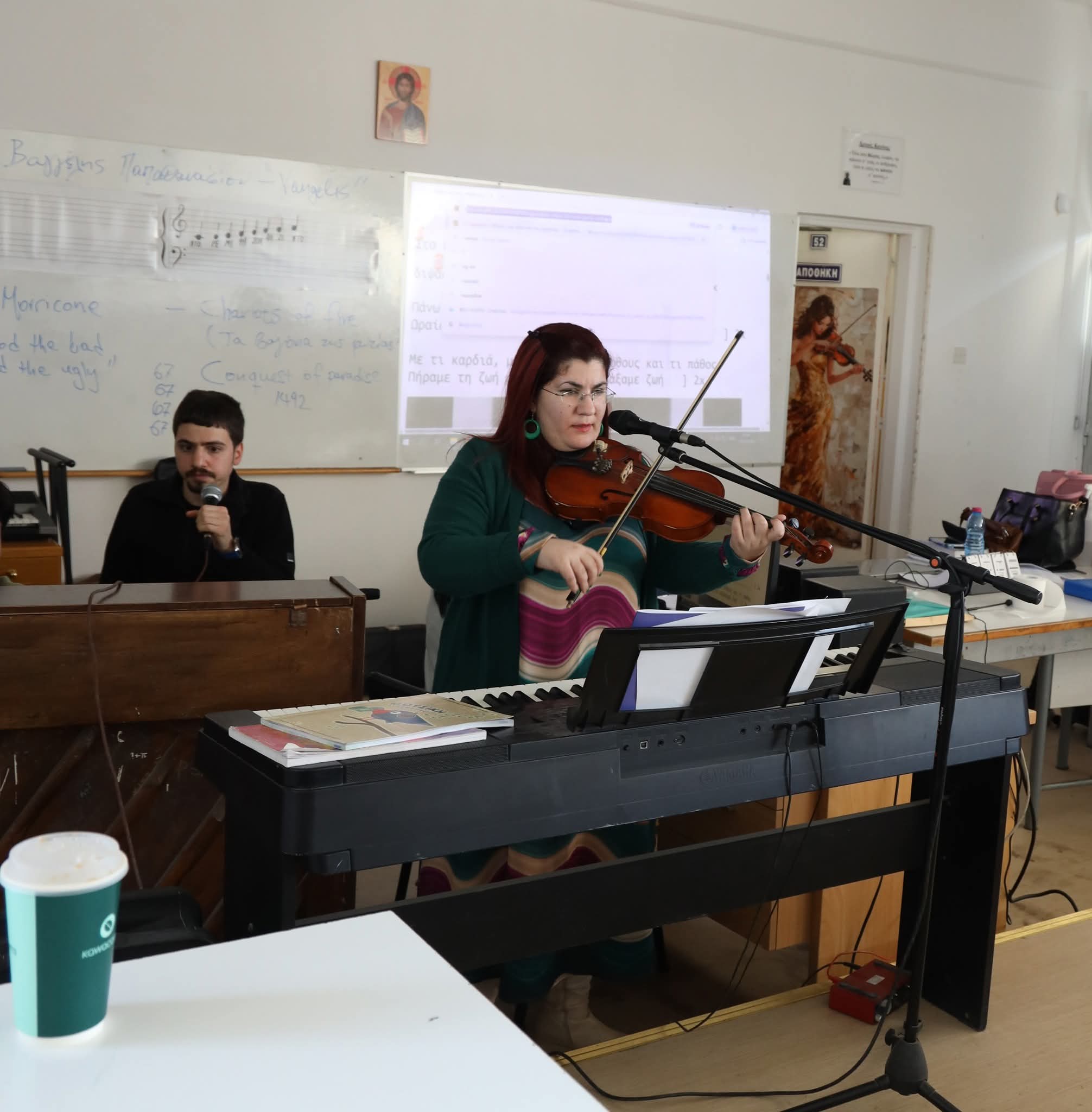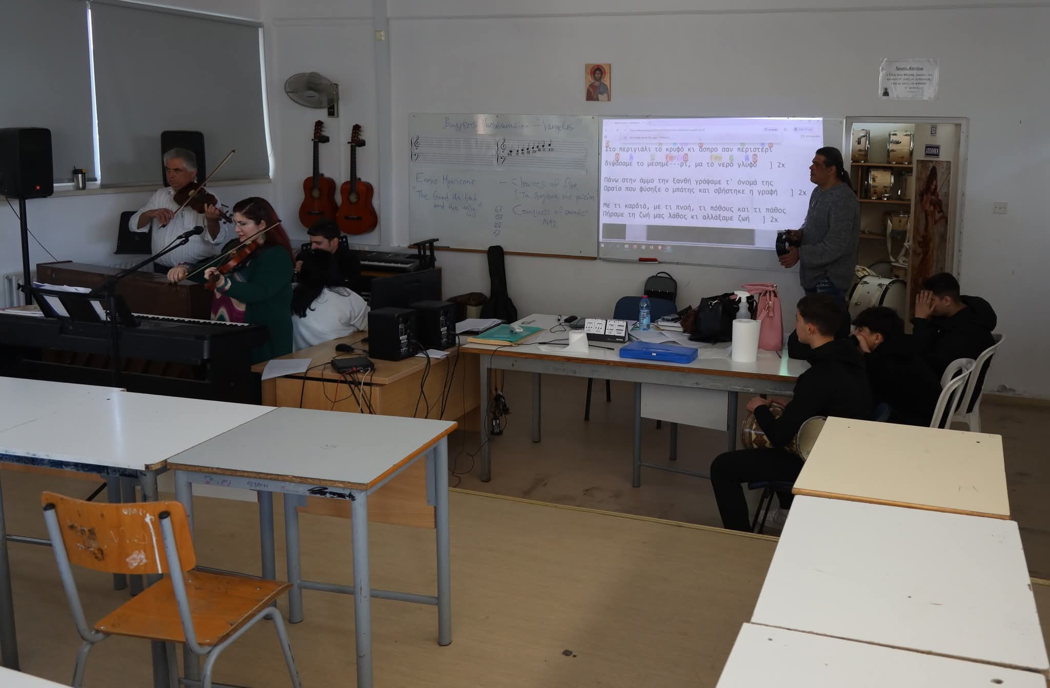 Είχαμε την τιμή να φιλοξενήσουμε στο Σχολείο μας μια ομάδα αξιόλογων μουσικών από τη Σχολή Τυφλών. Συγκεκριμένα μαζί μας είχαμε τον κ. Ντίνο Καρπασίτη, καθηγητή Μουσικής, την κ. Μαρία Πουλλή, μαθήτρια της Σχολής και διακεκριμένη σοπράνο με σπουδές στη μουσική, καθώς και τον κ. Ανδρέα Γαβριηλίδη, μαθητή της Σχολής ο οποίος παίζει βιολί, τραγουδά και ασχολείται με τη βυζαντινή μουσικη. Οι καλεσμένοι μας έπαιξαν μουσική και τραγούδησαν με τους μαθητές του τμήματος Γ7.