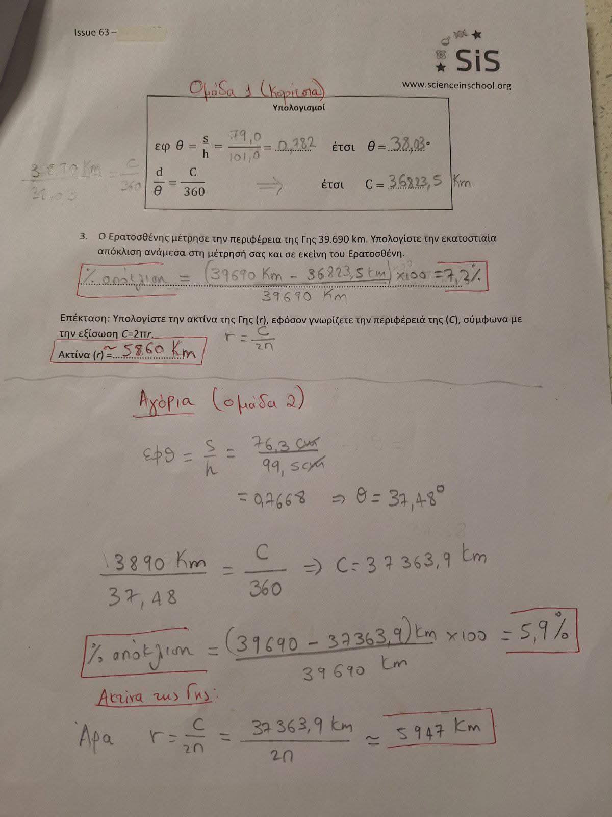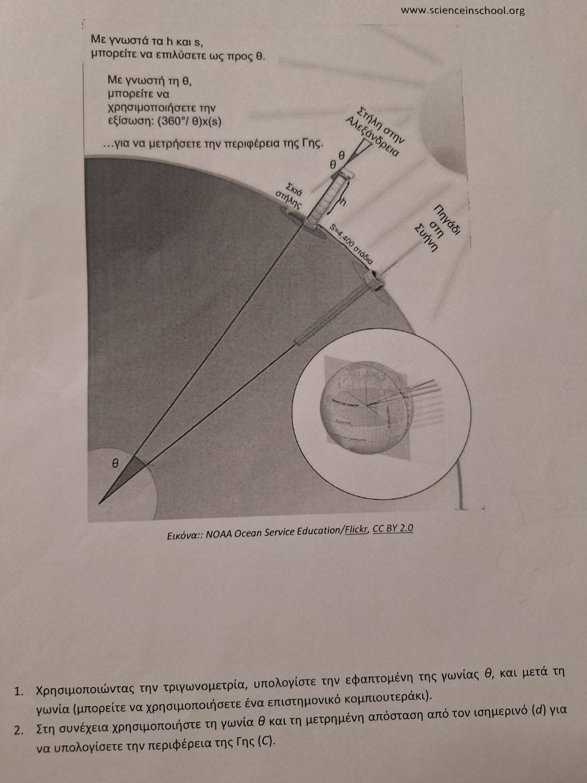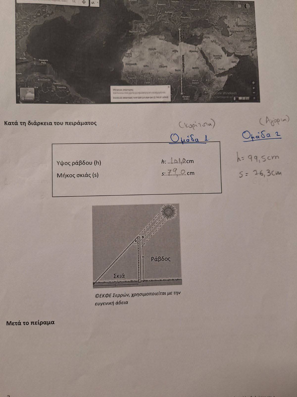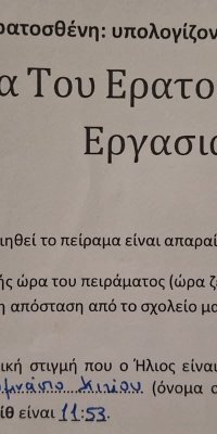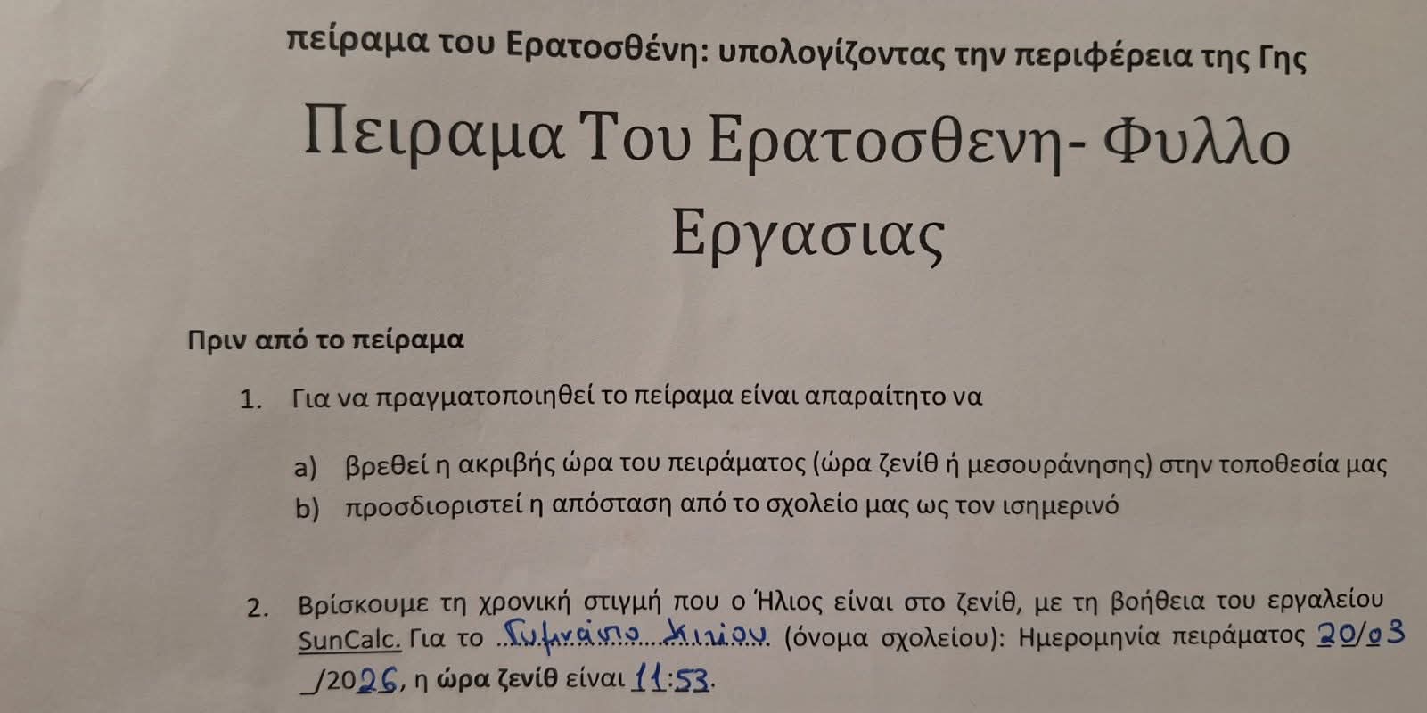 Η 21η Μαρτίου είναι η ημέρα εαρινής ισημερίας δηλαδή ο ήλιος βρίσκεται ακριβώς πάνω από τον ισημερινό και οι ακτίνες προσπίπτουν κάθετα. Κατά την ημέρα αυτή, πραγματοποιείται το πείραμα του Ερατοσθένη για τον υπολογισμό της περιφέρειας της Γης. Δύο ομάδες μαθητών μας μέτρησαν το μήκος της σκιάς μιας ράβδου, όταν ο ήλιος ήταν στο ζενίθ, δηλαδή μεσουρανούσε πάνω από το Σχολείο μας. Με τη βοήθεια της τριγωνομετρίας υπολόγισαν την περιφέρεια και την ακτίνα της Γης με πολύ μικρή εκατοστιαία απόκλιση!