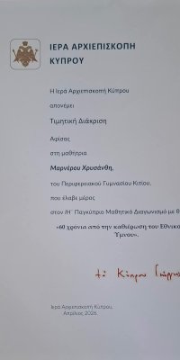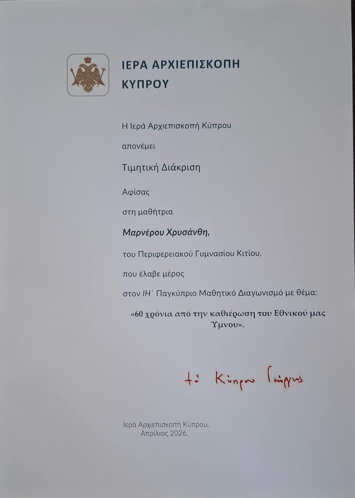 Τελετή βράβευσης του ΙΗ΄ Παγκύπριου Μαθητικού Διαγωνισμού Ιεράς Αρχιεπισκοπής Κύπρου με θέμα «60 χρόνια από την καθιέρωση του Εθνικού μας Ύμνου».